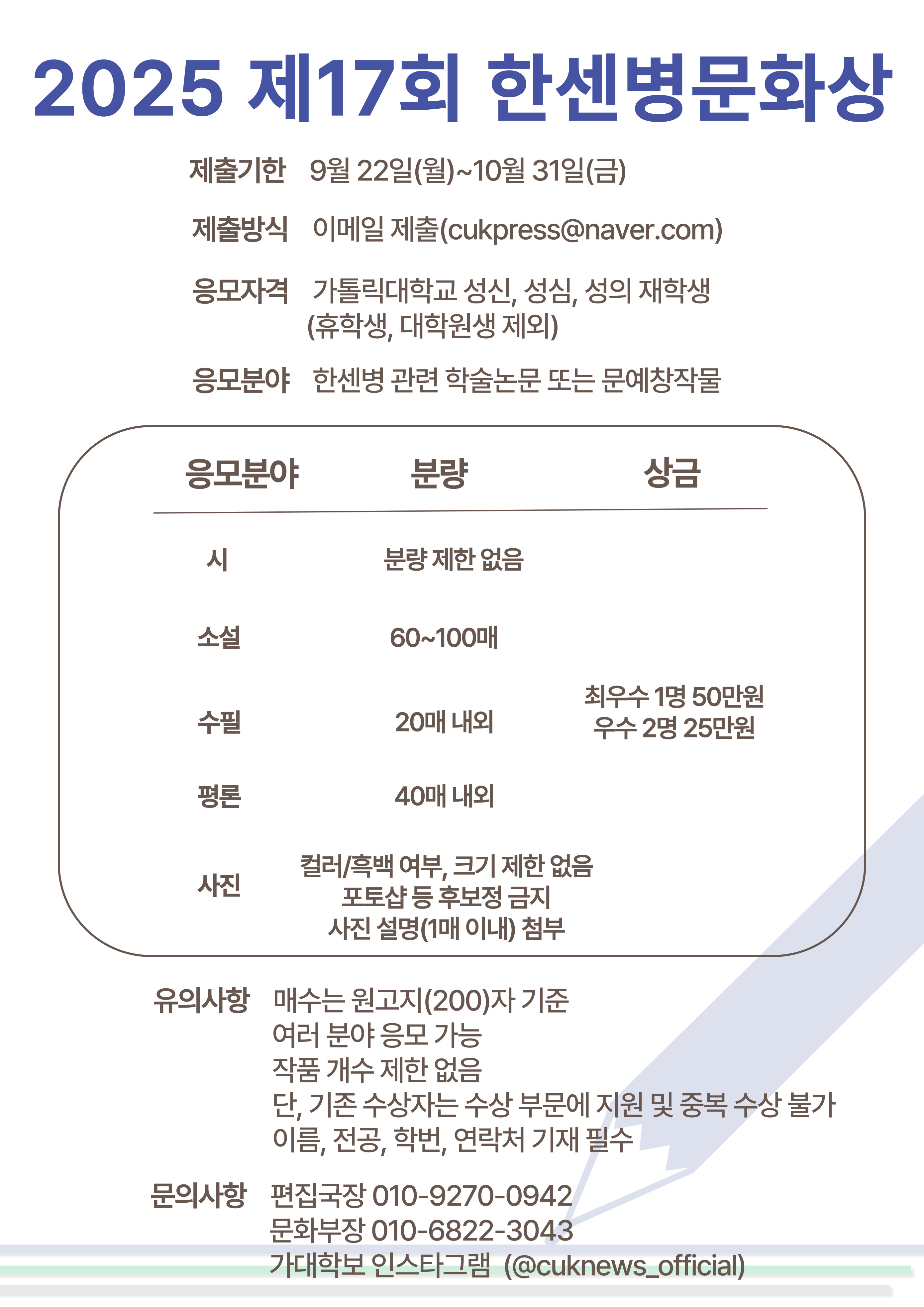 - 응모자격 : 가톨릭대학교 성신, 성심, 성의교정 재학생(휴학생, 대학원생 제외)
